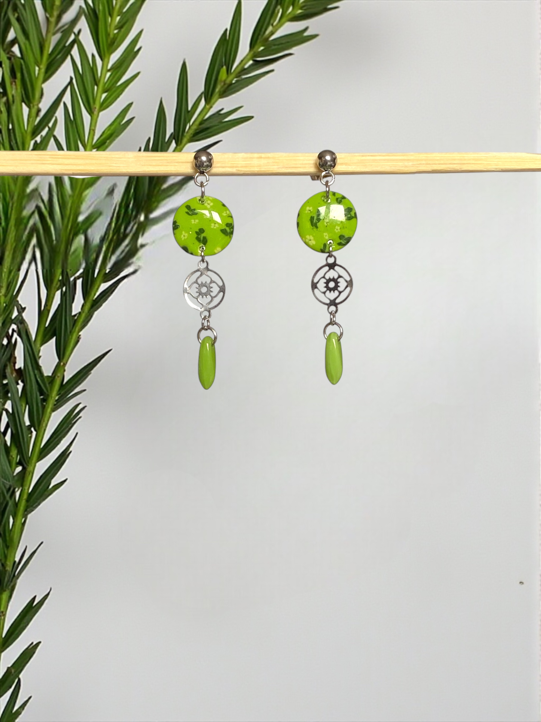 Chaque bijou est recouvert de résine. Pour préserver son éclat, je vous recommande de ne pas l’exposer à la lumière du soleil de façon prolongée. Un rayonnement trop vif pourrait altérer les couleurs.