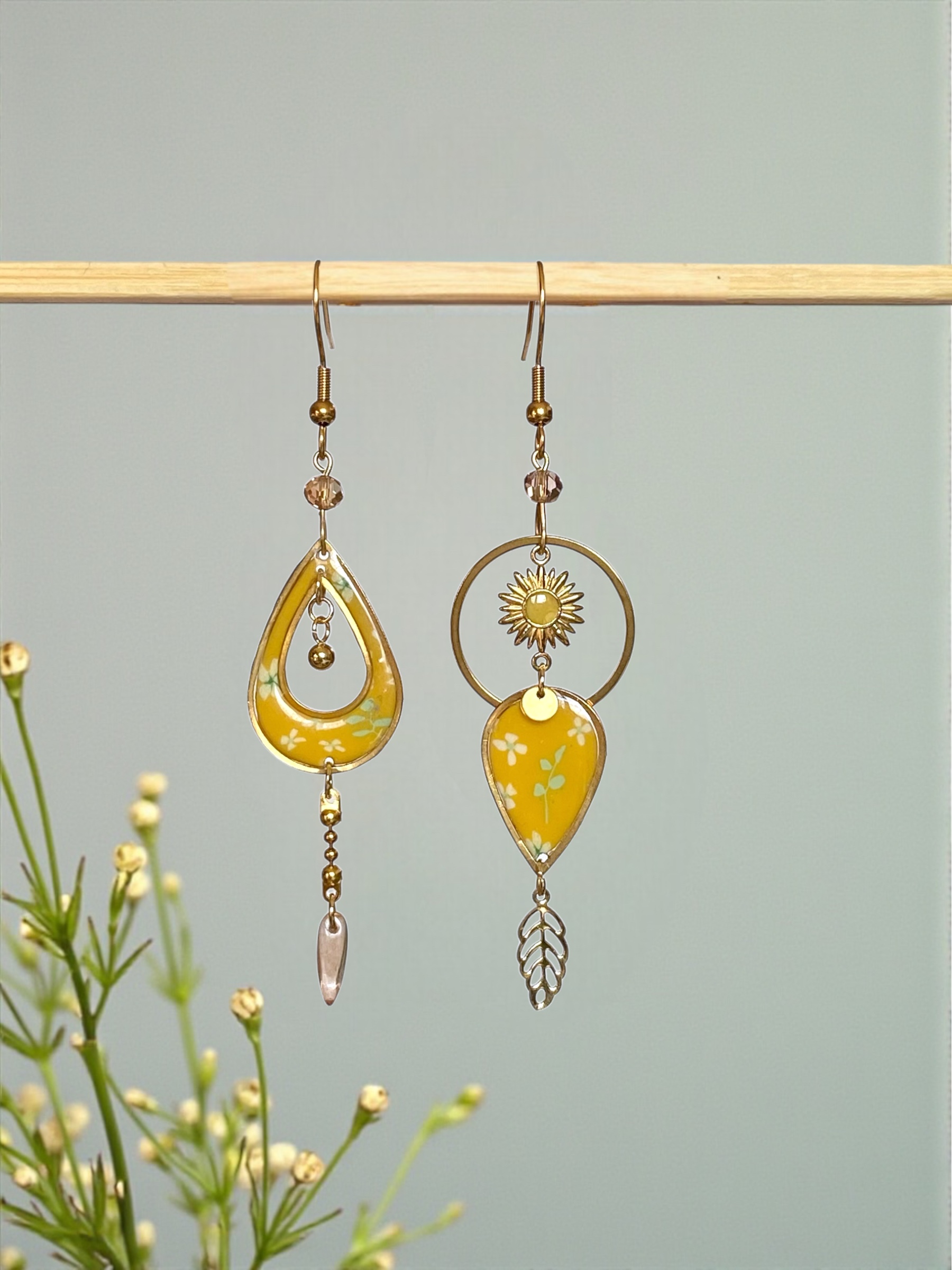 Chaque bijou est recouvert de résine. Pour préserver son éclat, je vous recommande de ne pas l’exposer à la lumière du soleil de façon prolongée. Un rayonnement trop vif pourrait altérer les couleurs.